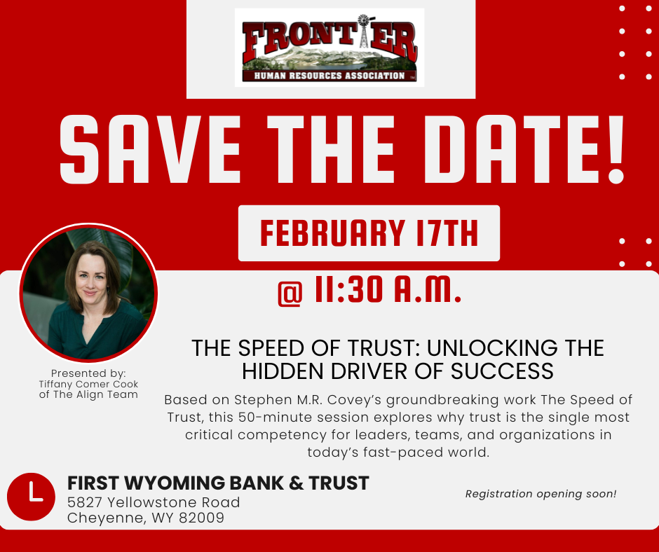 We are hard at work creating our brand new website! Watch for information to come on our February luncheon with Tiffany Comer Cook present on The Speed of Trust: Unlocking the Hidden Driver of Success. Save the date for February 17th from 11:30-1:00 PM at First Wyoming Bank and Trust.